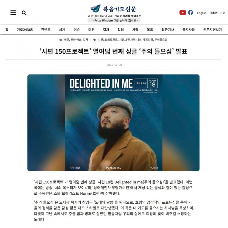 ‘시편 150프로젝트’가 열여덟 번째 싱글 ‘시편 18편 Delighted in me(주의 들으심)’을 발표했다. 이번 곡에는 방송 ‘너의 목소리가 보여4’와 ‘싱어게인3–무명가수전’에서 개성 있는 음색과 깊이 있는 감성으로 주목받은 소울 보컬리스트 Horim(호림)이 참여했다.