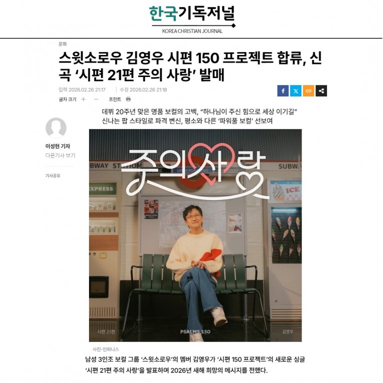 남성 3인조 보컬 그룹 ‘스윗소로우’의 멤버 김영우가 ‘시편 150 프로젝트’의 새로운 싱글 ‘시편 21편 주의 사랑’을 발표하며 2026년 새해 희망의 메시지를 전했다.